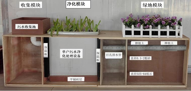 乐陵市结合当地农村常住人口较少、环境承载力大、农村社会发展、地形气候等特点,探索提出基于庭院或土地消纳的“黑灰源头分离+单户或联户资源化利用”的灰水资源化利用模式。该模式适用于常住人口规模较小、人均灰水产排量较少且房前屋后有较大消纳空间的非环境敏感区域村庄,是灰水生态处理资源化利用模式,由收集模块、生态净化模块(单户污水净化处理设备)、绿地模块3部分组成,如图2所示。