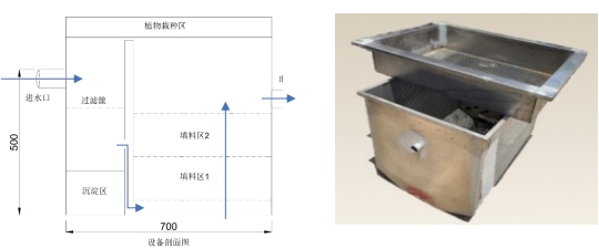 处理工艺流程总体分为三步,分别为一级沉淀、二级净化和三级净化。一级沉淀:灰水收集后首先进入收集池,通过初步沉淀去除大颗粒悬浮物;然后进入一体化单户污水净化处理设备,该设备由隔油/沉淀一体池和处理单元两部分组成(如图3所示),灰水中的油脂类和悬浮物可通过农户定期清理筛网和沉淀桶去除,以避免影响后续处理效果。二级净化:灰水进入处理单元后利用滤料及附着微生物实现净化处理,并为净化模块中种植的水生鸢尾等植物提供水分及氮磷等营养物质,实现灰水的进一步净化。三级净化:经过沉淀与一级净化后的灰水最终进入与农户“小三园”结合建设的绿地模块,一部分为植物生长提供水分、氮、磷等,另一部分通过土壤渗滤系统实现土地消纳,最终实现农村生活污水的就地资源化利用,有效解决农村生活污水外排导致的污水横流、异味及蚊蝇滋生等影响农村人居环境的问题。