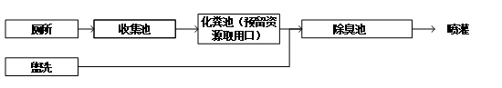 公厕粪污处理及尾水原位资源化利用:公厕污水以黑水为主,黑水先进入收集池,在收集池投加生物球载体及生物菌种进行预处理,处理后进入化粪池并投加高效生物菌种用于深度处理,同时预留取用口便于农户取用,剩余出水与直排的盥洗水一起进入除臭装置,经除臭后用于附近景观喷灌。
