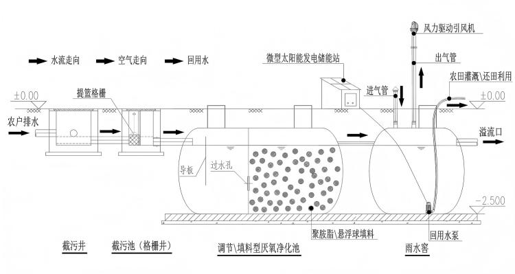 图1 填料型厌氧池+雨水窖及资源化利用工艺流程图