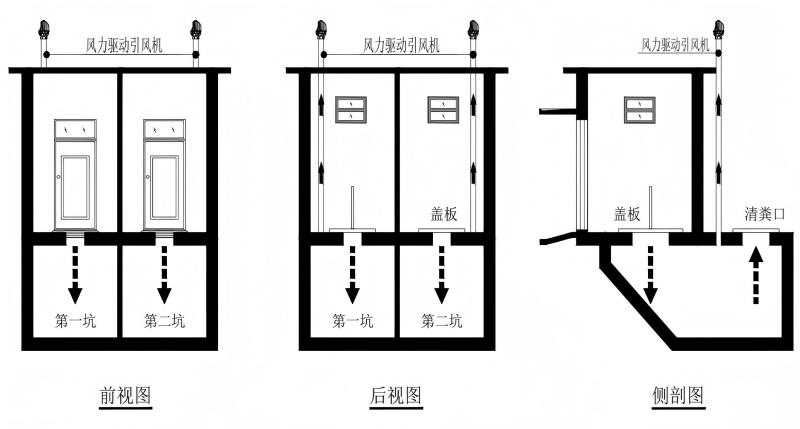 该模式主要是处理生活黑水,适用于陕北高寒、缺水且农户有使用旱厕习惯的地区。卫生旱厕(双坑交替式)黑水资源化技术模式并排建造两个厕坑(储粪池),每个厕坑上设置一个便器,当使用的一个厕坑满后,将其密封堆沤,同时启用第二个厕坑;当第二个厕坑满后,第一个厕坑已厌氧堆沤6个月以上,农户自行清掏,资源化还田施肥,将第二个厕坑密封堆沤,使用已清掏的第一个厕坑,如此交替循环,详见图3。该模式减轻了清掏成本,还保证了粪污发酵时间,确保粪污无害化利用。同时,按照经济实用的原则,利用陕北地区充沛的风力资源,通过安装风力驱动抽风排气风帽(见图4),解决了传统旱厕的恶臭问题。