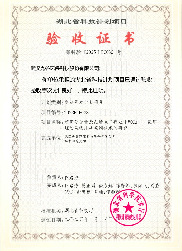 针对超分子乙烯行业中 VOCs- 二氯甲烷污染物尾气达标排放的瓶颈难题,武汉光谷环保科技股份有限公司研发团队研发出 “冷凝 — 吸收 — 吸附” 耦合新工艺,已取得《A Novel Process of Pressurized Condensation-Coupled Absorption for Dichloromethane Removal from Exhaust Gas in Supra molecular Polyethylene Production》、《VOCs 治理技术在 UHMWPE 纤维行业的应用》、《一种二氯甲烷尾气处理装置》、《一种 UHMWPE 纤维行业中耦合 VOCs 治理的节能高效曝气系统及方法》、《干法冻胶纺丝工艺中的多流股阻断稳压冷凝装置及方法》等多项知识产权。