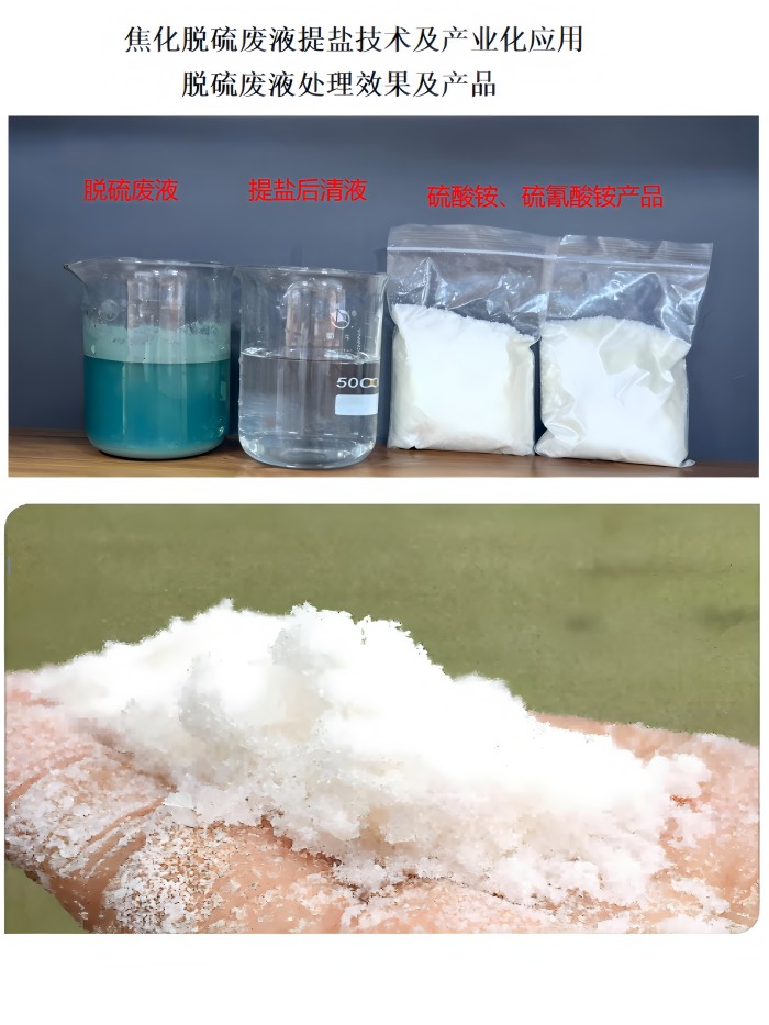 该科技成果适用于所有采用湿法煤气脱硫工艺的焦炭、化肥生产行业,通过关键专利技术(发明专利号:ZL201811054421.7),彻底解决了原提盐工艺中产生的硫代硫酸铵与硫酸铵固体废物的难题,将无市场需求的硫代硫酸铵转化为硫酸铵,并经过专业分离,生产优质硫酸铵及硫氰酸铵产品销售,产品质量好、纯度高,硫酸铵含氮量>20.5%,硫氰酸铵产品纯度≥98%,产品收益明显。提盐后的清液盐含量可控制在10g/L以下,硫氰酸根离子含量控制在0.5g/L以下,清液可返回脱硫系统中循环使用、节省了新水的投入,实现了煤气脱硫生产系统中水回用的完美闭环,变废为宝。彻底解决了焦化脱硫废液有效处理的难题,填补了行业空缺。