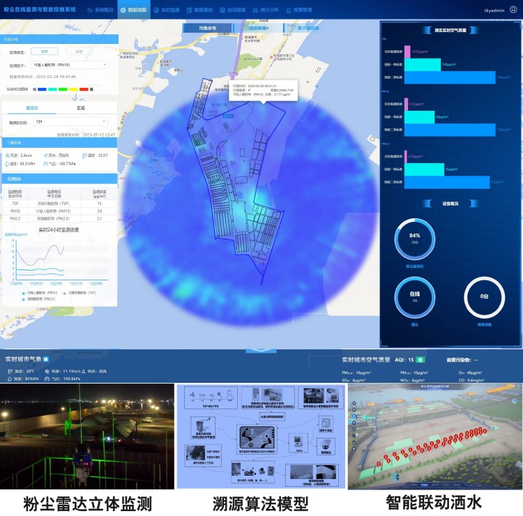 针对上述散货港口粉尘导致的物料损失、环境健康风险等问题,交通运输部天津水运工程科学研究所(以下简称天科所)科研团队历经近十年,自主研发了煤炭矿石码头智能洒水抑尘联动控制技术,基于物联网、大数据、云计算、人工智能等多维技术深度融合的数字孪生系统,实现多个作业流程智能洒水抑尘联动协同控制模式以及全作业流程粉尘控制的一体化和数字化,构建了码头“主动抑尘+智慧决策+绿色低碳”的粉尘控制新模式,填补了国内多项空白并达到国际领先水平。